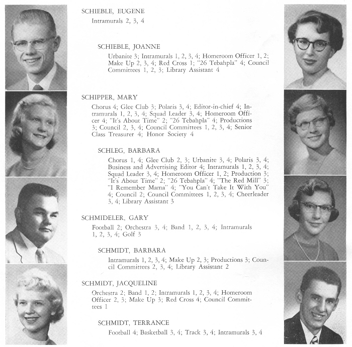 1956 Sheboygan North High School, Page 98: Eugene Schieble, Joanne Schieble, Mary Schipper, Barbara Schleg, Gary Schmideler, Barbara Schmidt, Jacqueline Schmidt, Terrance Schmidt.