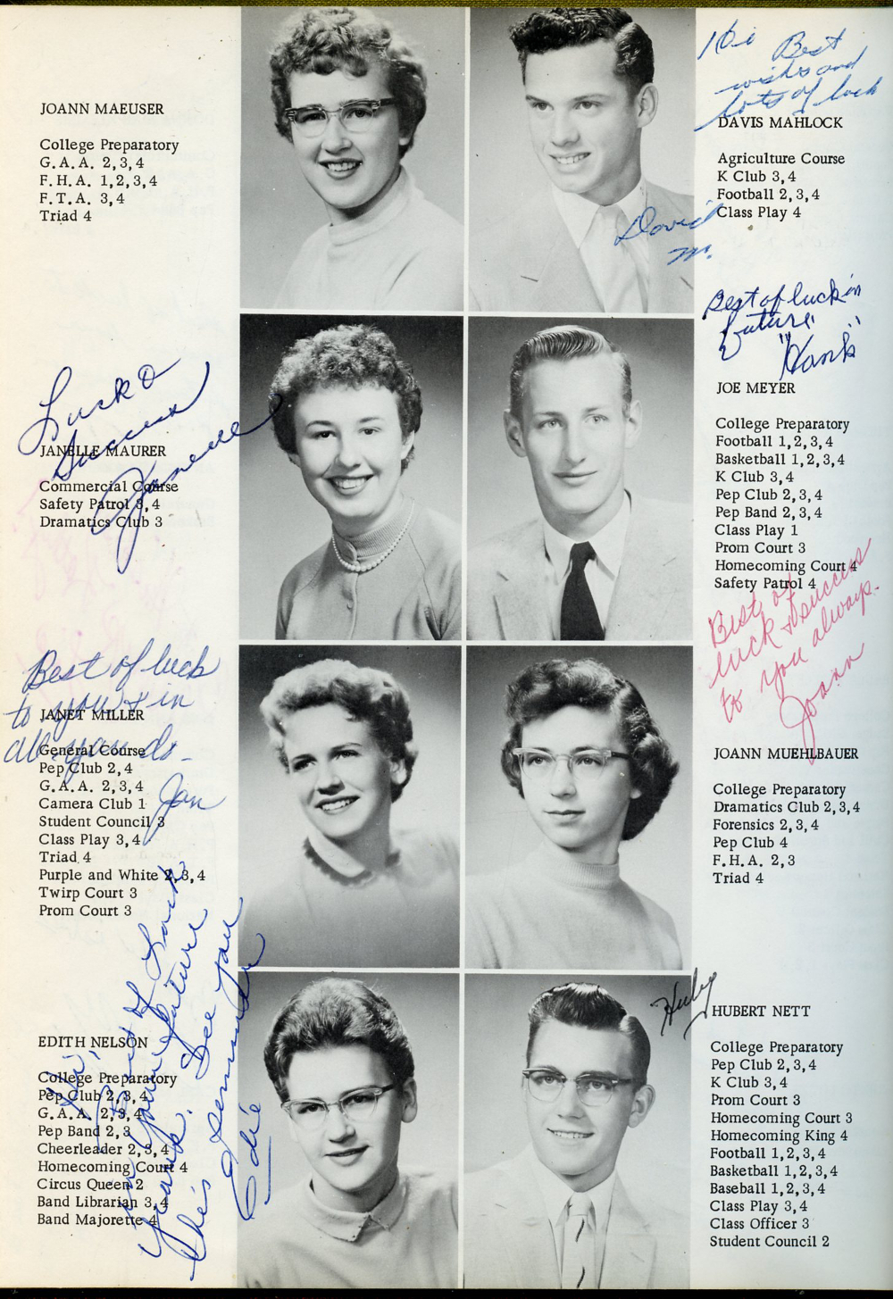 1957 Kiel High School, Page 58: Joann Maeuser, Davis Mahlock, Janelle Maurer, Joe Meyer, Janet Miller, Joann Muehlbauer, Edith Nelson, Hubert Nett.