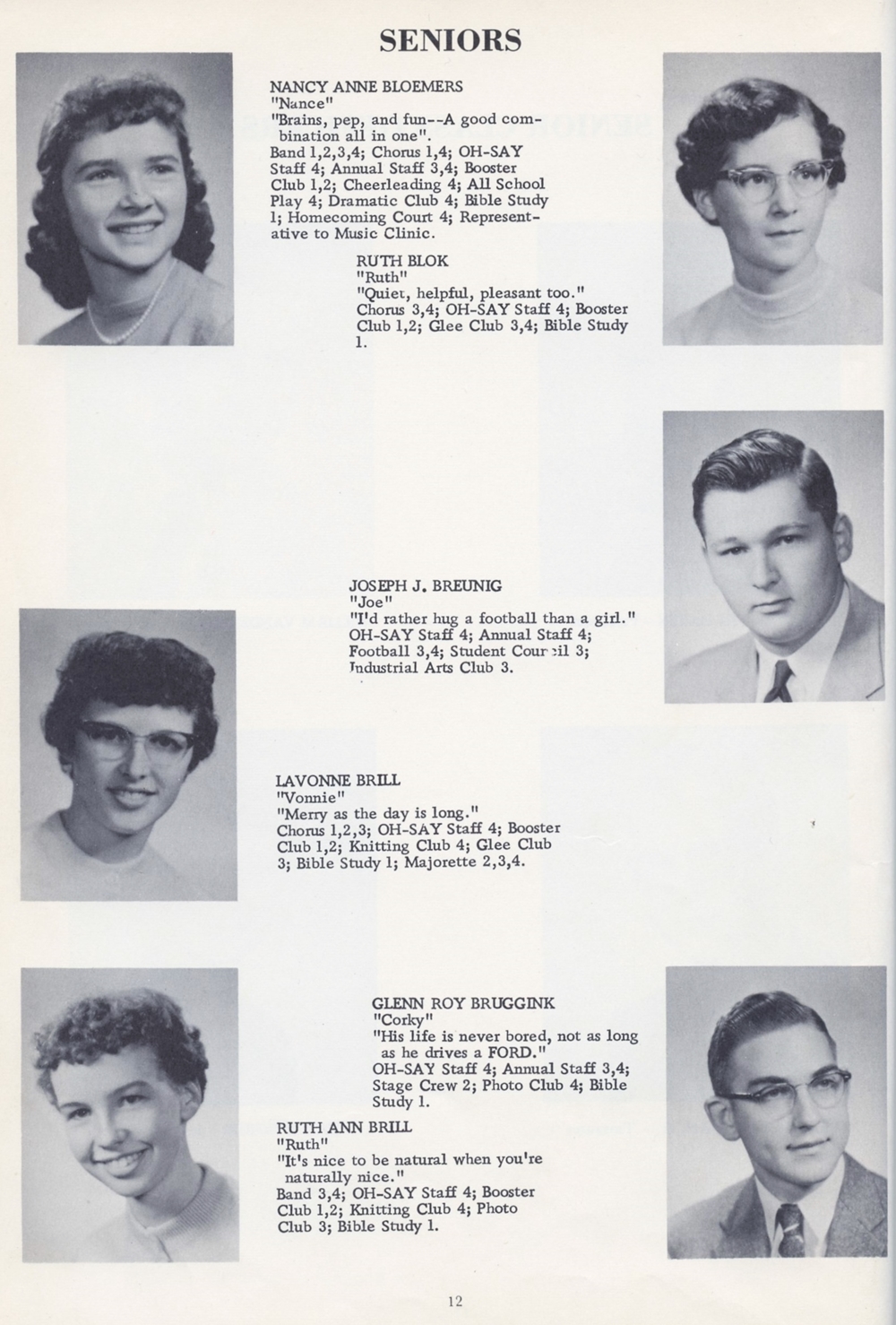 1957 Oostburg High School, Page 12: Nancy Anne Bloemers, Ruth Block, Joseph Breunig, Lavonne Brill, Ruth Ann Brill, Glenn Roy Brunnink.