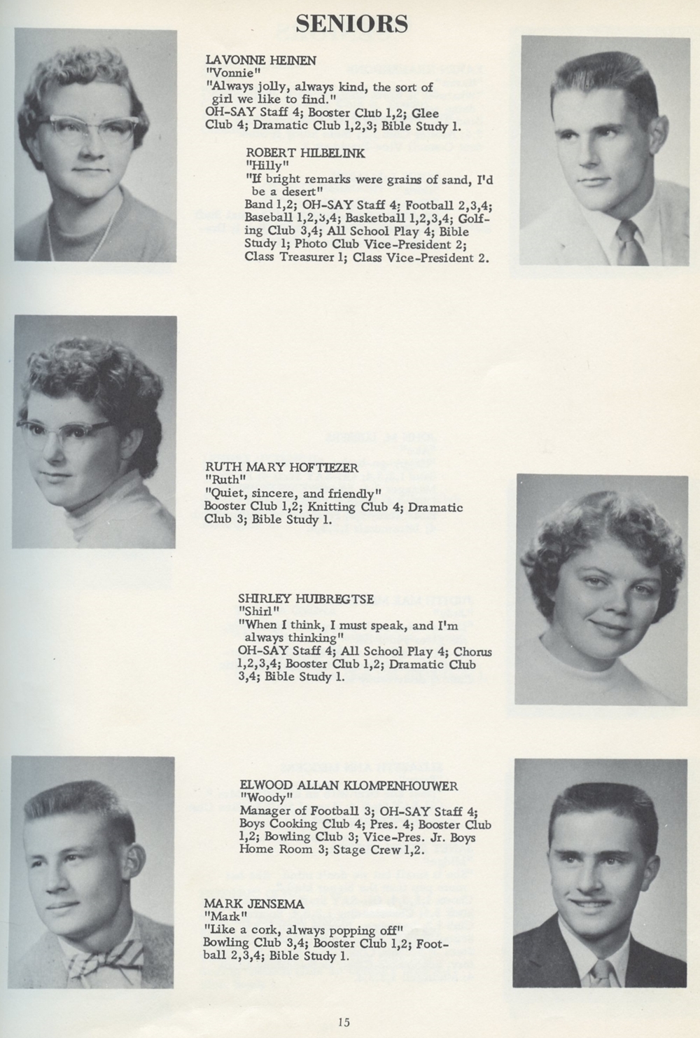 1957 Oostburg High School, Page 15: Lavonne Heinen, Robert Hilbelink, Ruth Mary Hoftiezer, Shirley Huibregtse, Mark Jensema, Elwood Allan Klompenhouwer.