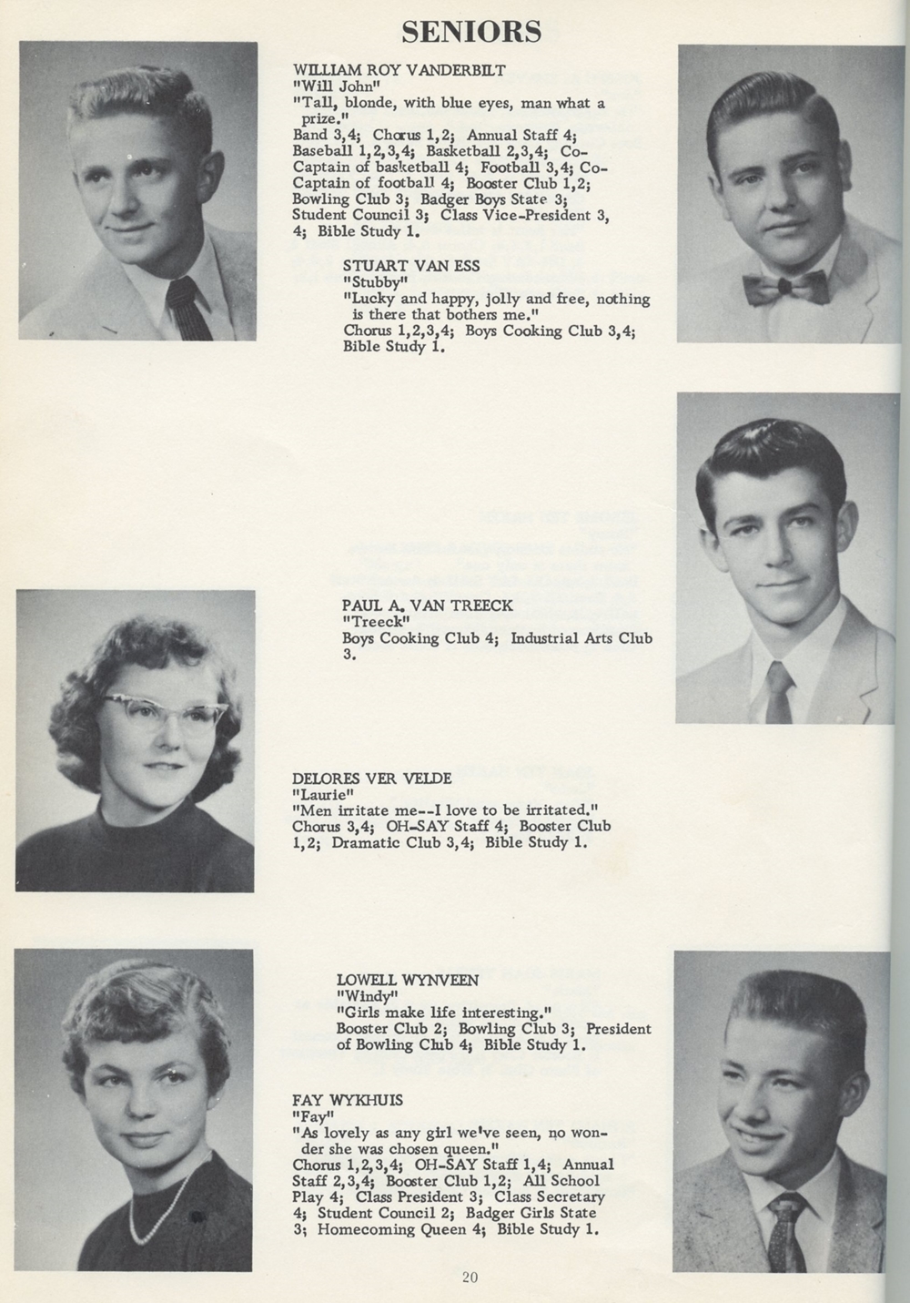 1957 Oostburg High School, Page 20: William Roy Vanderbilt, Stuart Van Ess, Paul A. Van Treeck, Delores Ver Velde, Fay Wykhuis, Lowell Wynveen.