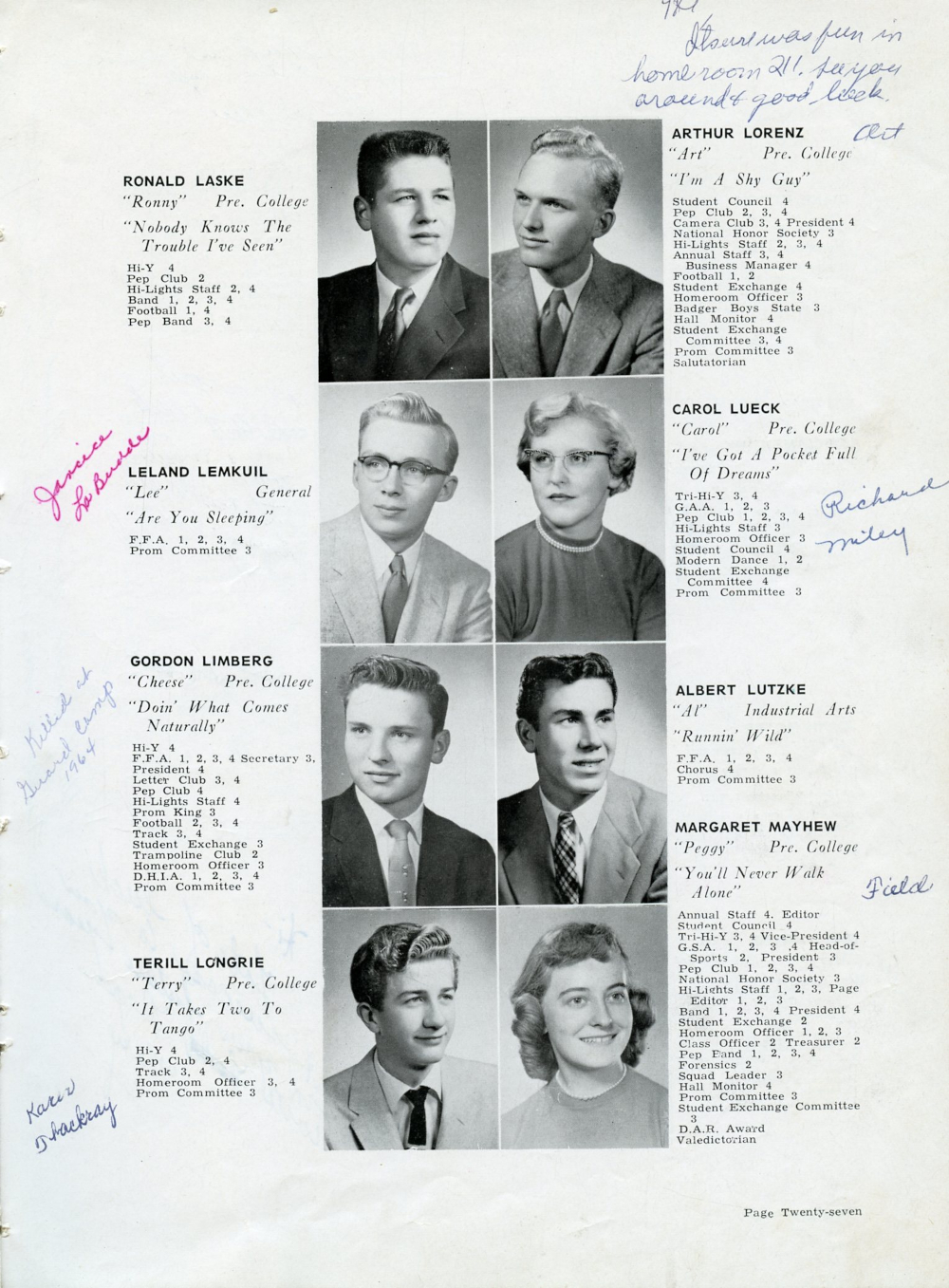 1957 Plymouth High School Yearbook Page 27: Ronald Laske, Leland Lemkuil, Gordon Limberg, Terill Longrie, Arthur Lorenz, Carol Lueck, Albert Lutzke, Margaret Mayhew.