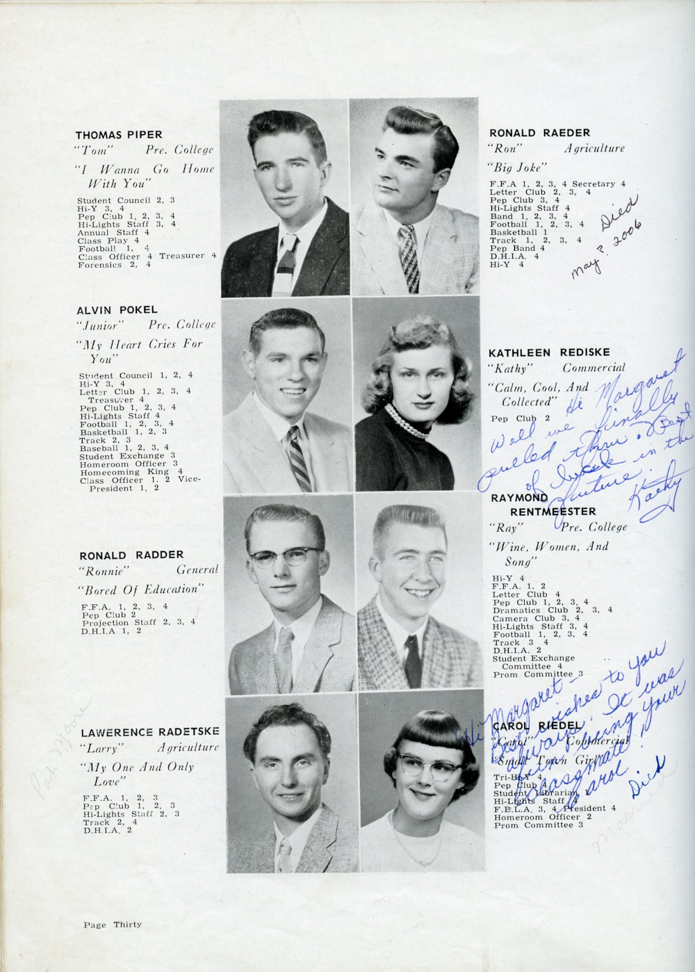 1957 Plymouth High School Yearbook Page 30: Thomas Piper, Alvin Pokel, Ronald Radder, Lawerence Radetske, Ronald Raeder, Kathleen Rediske, Raymond Rentmeester, Carol Riedel.