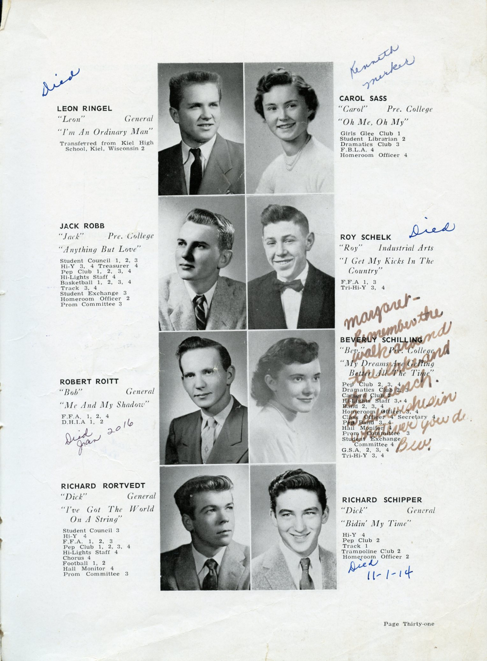 1957 Plymouth High School Yearbook Page 31: Leon Ringel, Jack Robb, Robert Roitt, Richard Rortvedt, Carol Sass, Rly Schelk, Beverly Schilling, Richard Schipper.