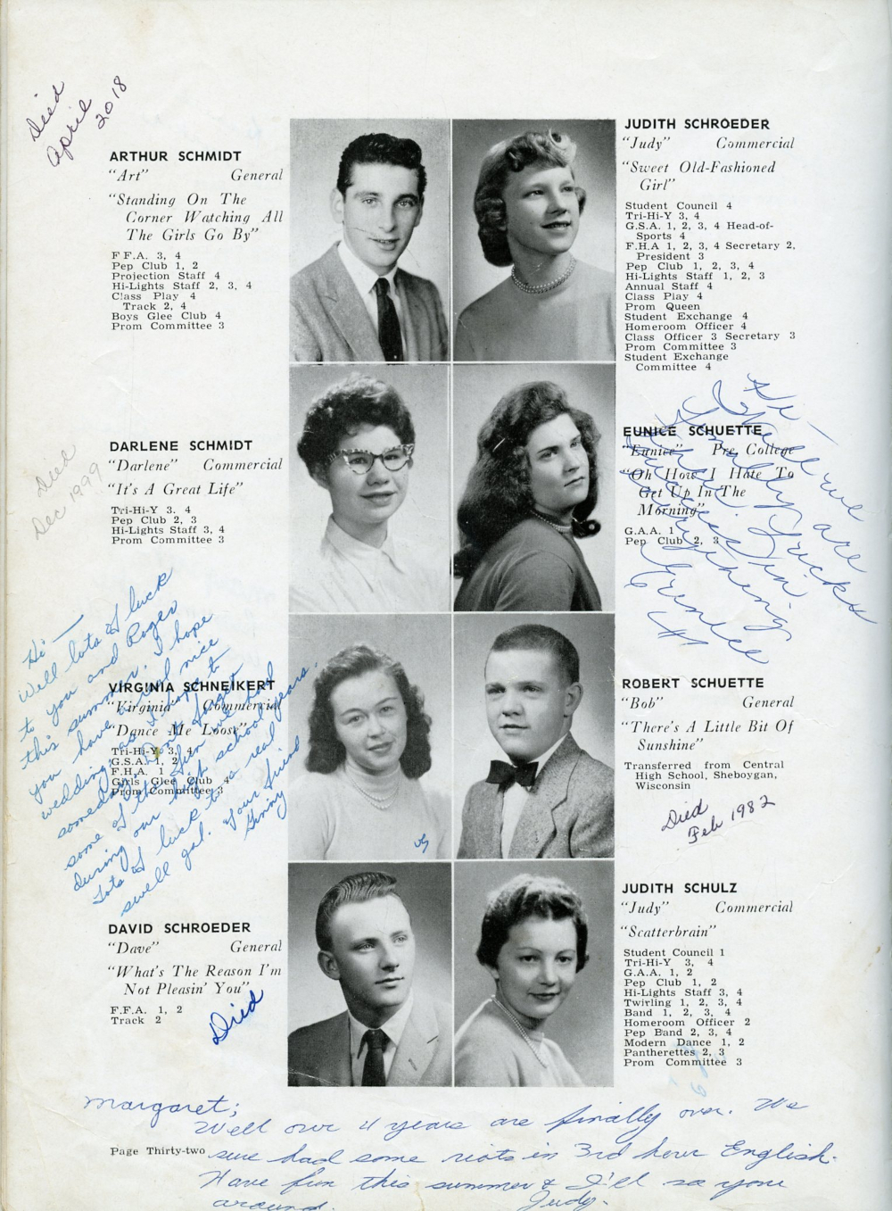 1957 Plymouth High School Yearbook Page 32: Arthur Schmidt, Darlene Schmidt, Virginia Schneikert, David Schroeder, Judith Schroeder, Eunice Schuette, Robert Schuette, Judith Schulz.