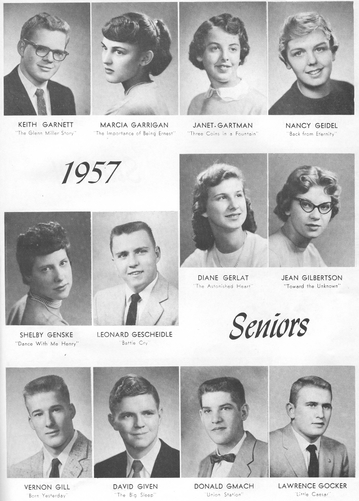 1957 Sheboygan Central High School, Page 15: Keith Garnett, Marcia Garrigan, Janey Gartman, Nancy Geidel, Shelby Genske, Leonard Gescheidle, Diane Gerlat, Jean Gilbertson, Vernon Gill, David Given, Donald Gmach, Lawrence Gocker.