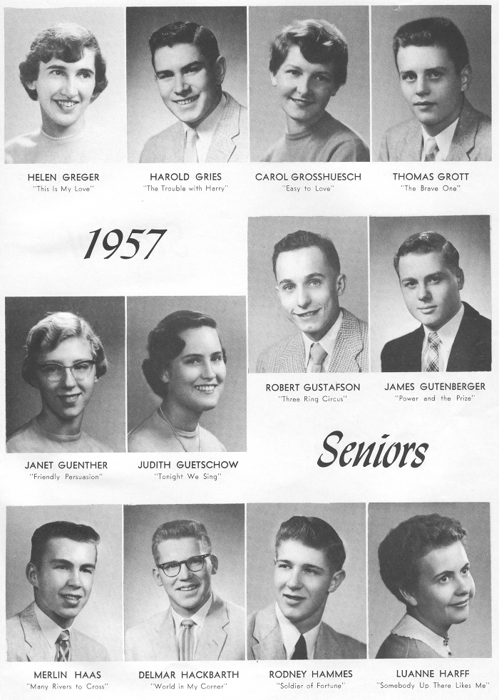 1957 Sheboygan Central High School, Page 17: Helen Greger, Harold Gries, Carol Grosshuesch, Thomas Grott, Janet Guenther, Judith Guetschow, Robert Gustafson, James Gutenberger, Merlin Haas, Delmar Hackbarth, Rodney Hammes, Luanne Harff.
