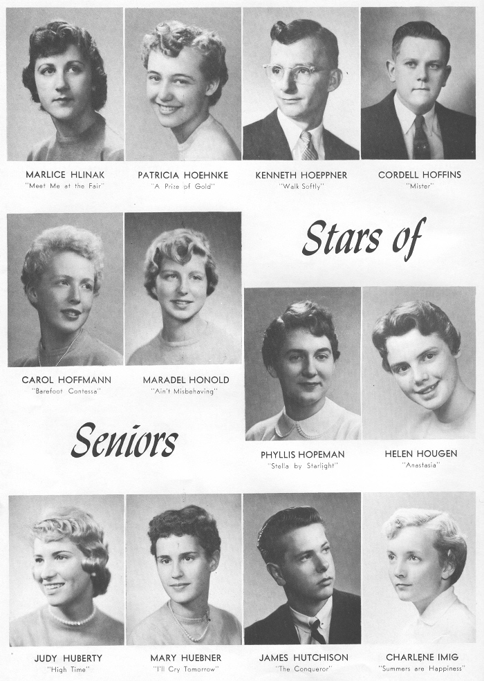 1957 Sheboygan Central High School, Page 20: Marlice Hlinak, Patricia Hoehnke, Kenneth Hoeppner, Cordell Hoffins, Carol Hoffmann, Maradel Honold, Payllis Hopeman, Helen Hougen, Judy Huberty, Mary Huebner, James Hutchison, Charlene Imig.