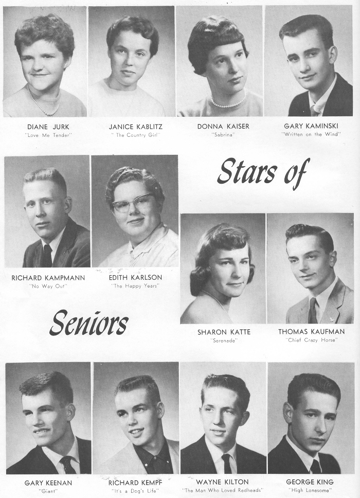 1957 Sheboygan Central High School, Page 22: Diane Jurk, Janice Kablitz, Donna Kaiser, Gary Kaminski, Richard Kampmann, Edith Karlson, Sharon Katte, Thomas Kaufman, Gary Keenan, Richard Kempf, Wayne Kilton, George King.
