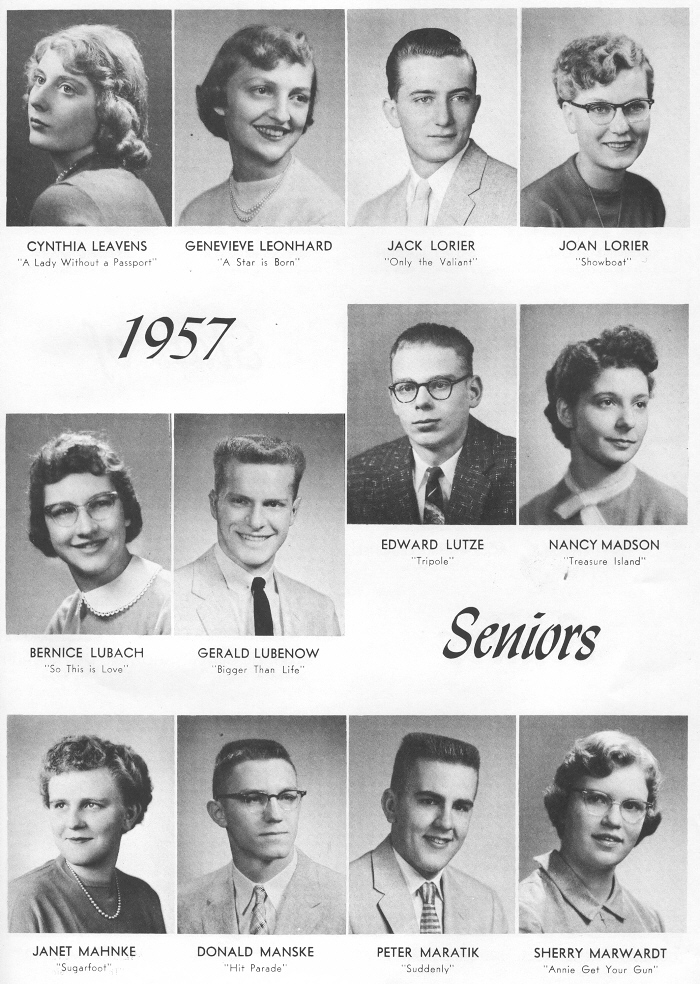 1957 Sheboygan Central High School, Page 25: Cynthia Leavens, Genevieve Leonhard, Jack Lorier, Joan Lorier, Bernice Lubach, Gerald Lubenow, Edward Lutze, Nancy Madson, Janet Mahnke, Donald Manske, Peter Maratik, Sherry Marwardt.