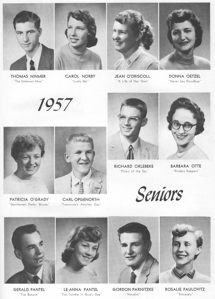 1957 Sheboygan Central High School, Page 29: Thomas Ninmer, Carol Norby, Jean O'Driscoll, Donna Oetzel, Patricia O'Grady, Carl Opgenorth, Richard Orlebeke, Barbara Otte, Gerald Pantel, Le Anna Pantel, Gordon Parnitzke, Rosalie Paulovitz.