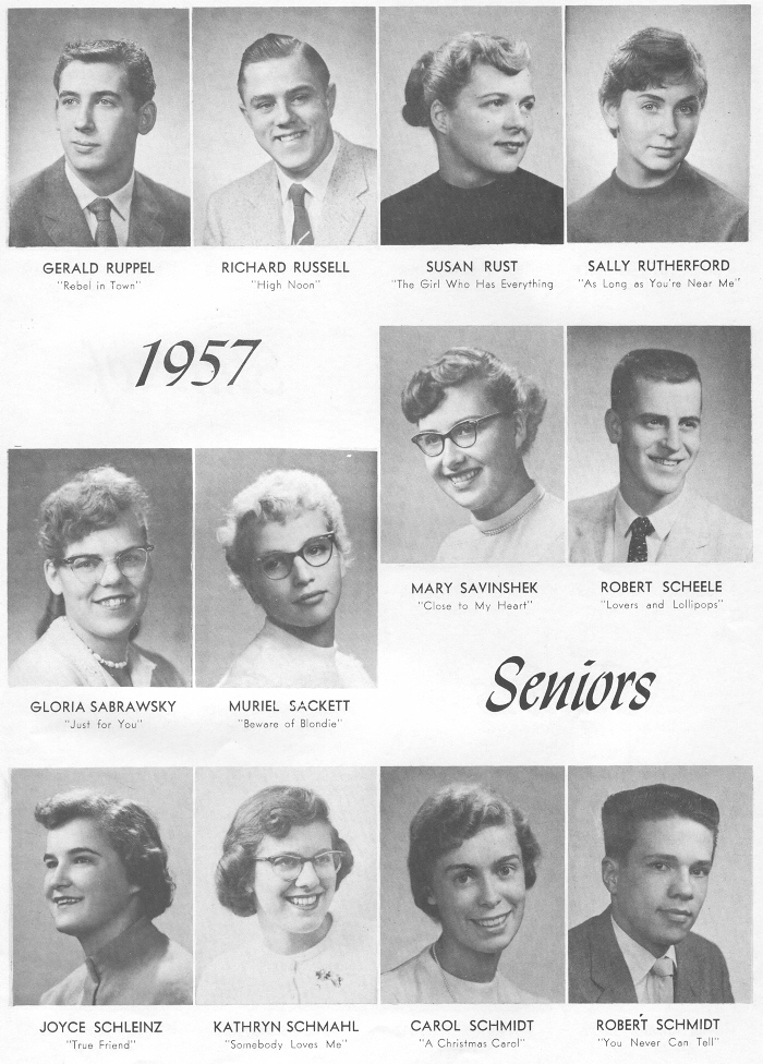 1957 Sheboygan Central High School, Page 33: Gerald Ruppel, Richard Russell, Susan Rust, Sally Rutherford, Gloria Sabrawsky, Muriel Sackett, Mary Savinshek, Robert Scheele, Joyce Schleinz, Kathryn Schmahl, Carol Schmidt, Robert Schmidt.