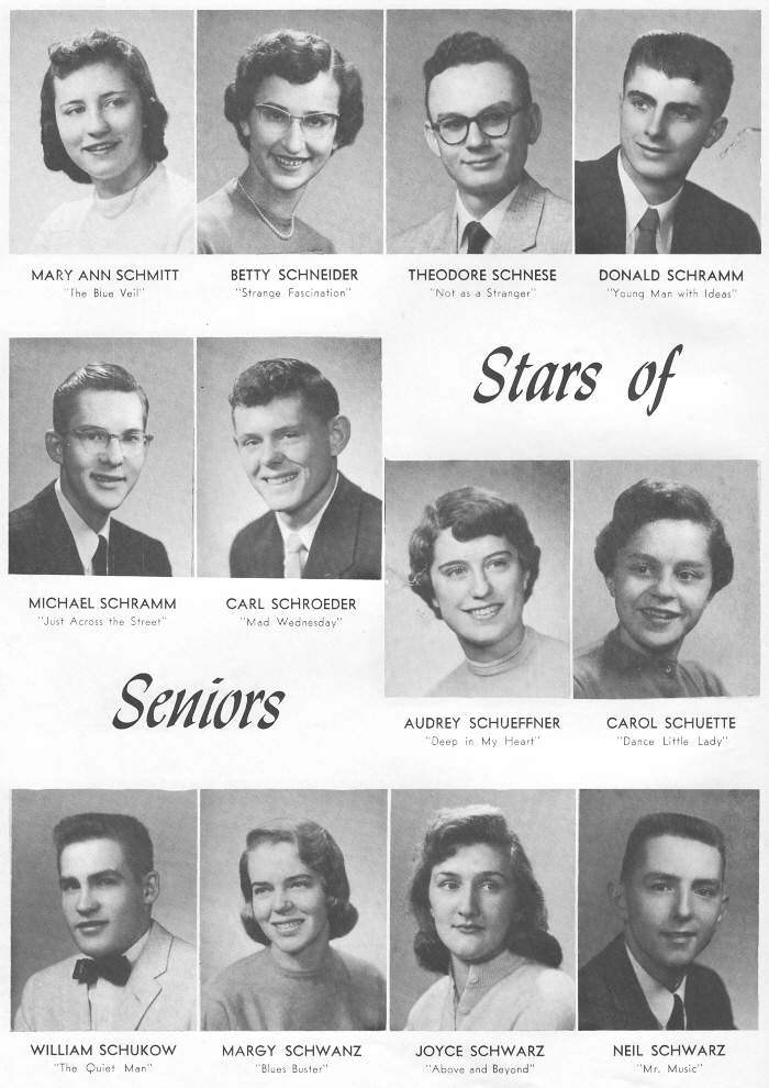 1957 Sheboygan Central High School, Page 34: Mary Ann Schmitt, Betty Schneider, Theodore Schnese, Donald Schramm, Michael Schramm, Carl Schroeder, Audrey Schueffner, Carol Schuette, William Schukow, Margy Schwanz, Joyce Schwarz, Neil Schwarz.