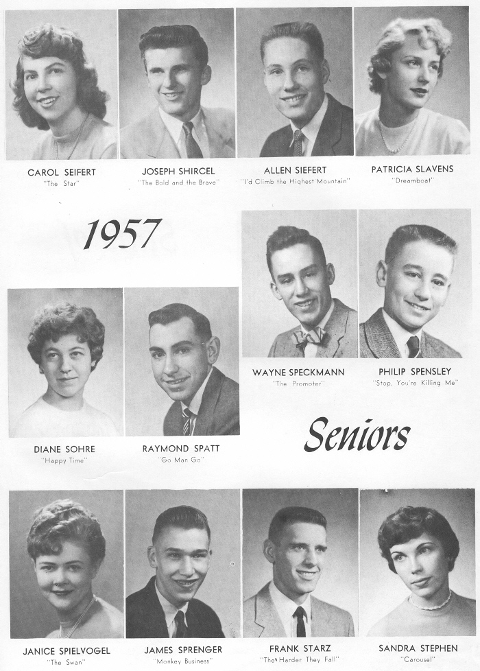 1957 Sheboygan Central High School, Page 35: Carol Seifert, Joseph Shircel, Allen Siefert, Patricia Slavens, Diane Shore, Raymond Spatt, Wayne Speckmann, Philip Spensley, Janice Spielvogel, James Sprenger, Frank Starz, Sandra Stephen.