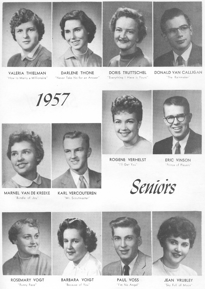 1957 Sheboygan Central High School, Page 37: Valeria Thielman, Darlene Thone, Doris Truttschel, Donald Van Calligan, Marnel Van De Creeke, Karl Vercouteren, Rogene Verhelst, Eric Vinson, Rosemary Vogt, Barbara Voigt, Paul Voss, Jean Vrubley.