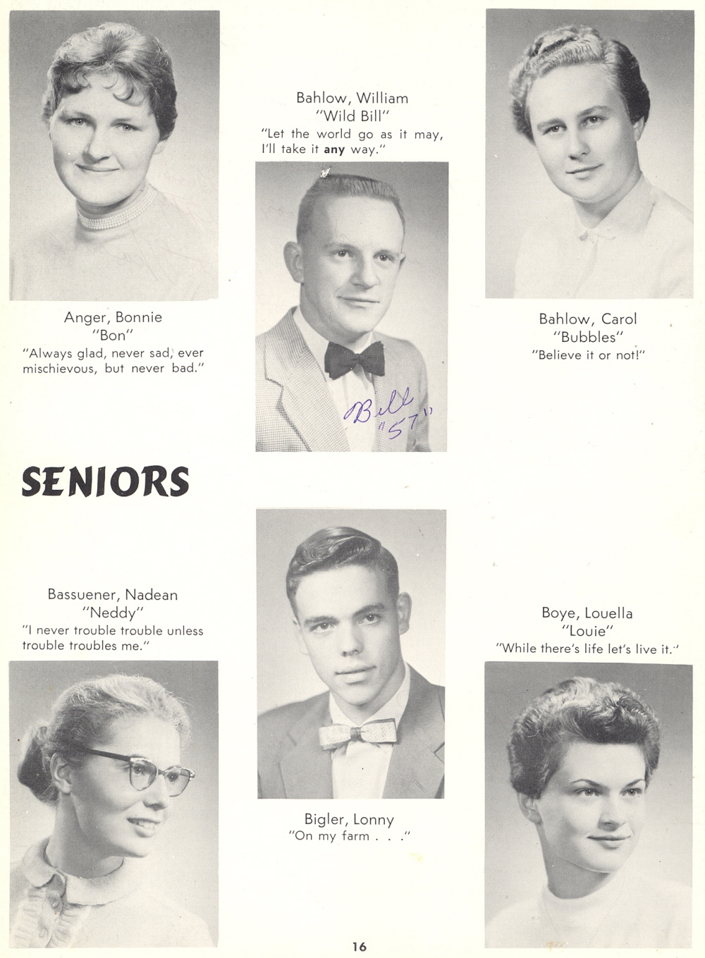 1957 Sheboygan Falls High School, Page 16: Bonnie Anger, William Bahlow, Carol Bahlow, Nadean Bassuener, Lonny Bigler, Louella Boye.