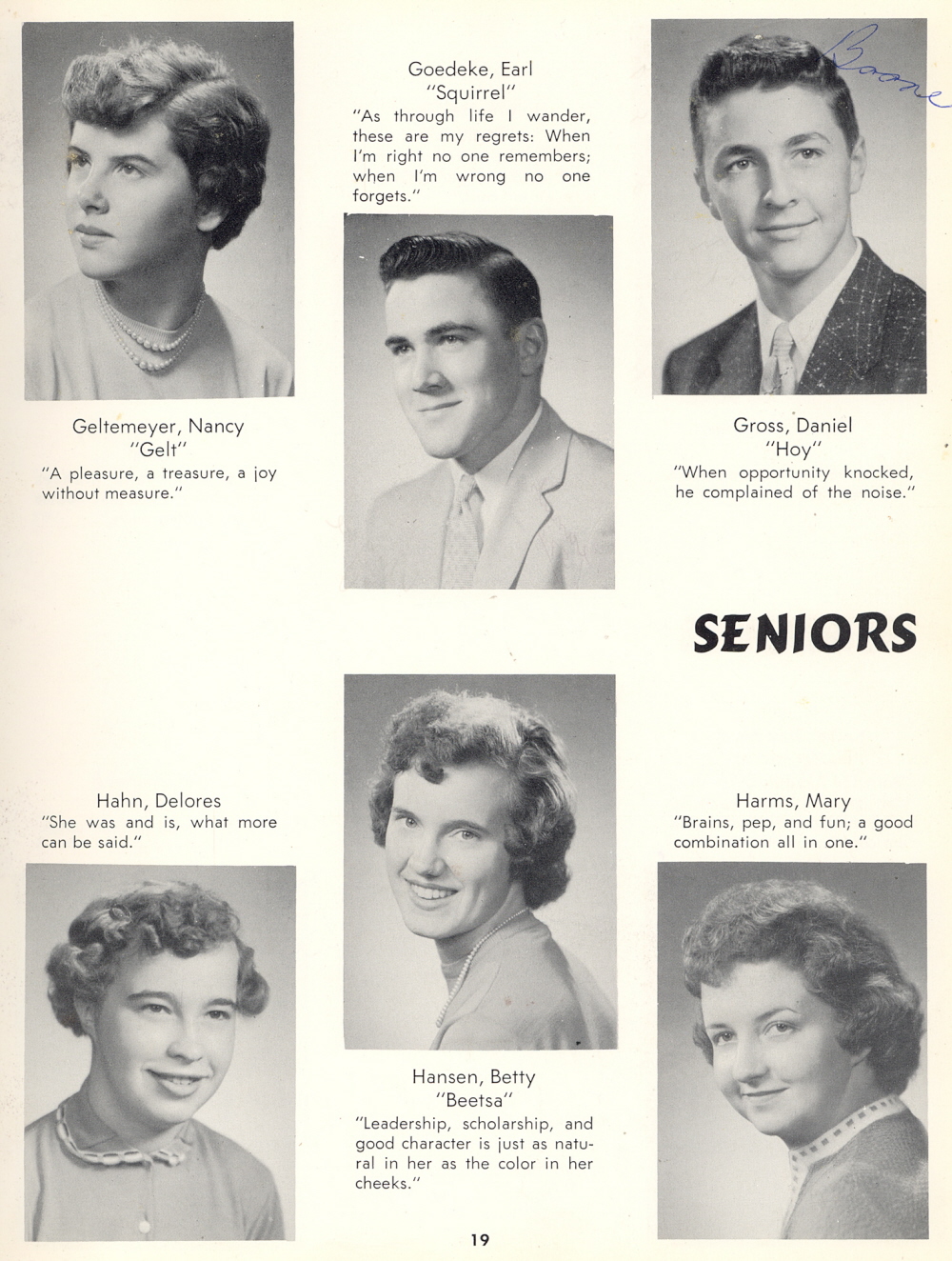 1957 Sheboygan Falls High School, Page 19: Nancy Geltemeyer, Earl Goedeke, Daniel Gross, Delores Hahn, Betty Hansen, Mary Harms.