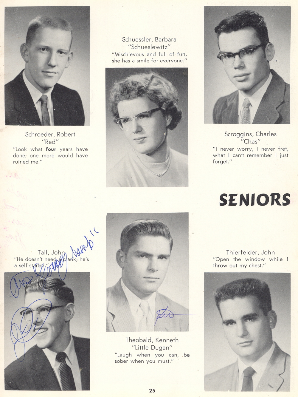 1957 Sheboygan Falls High School, Page 25: Robert Schroeder, Barbara Schuessler, Charles Scroggins, John Tall, Kenneth Theobald, John Thierfelder.