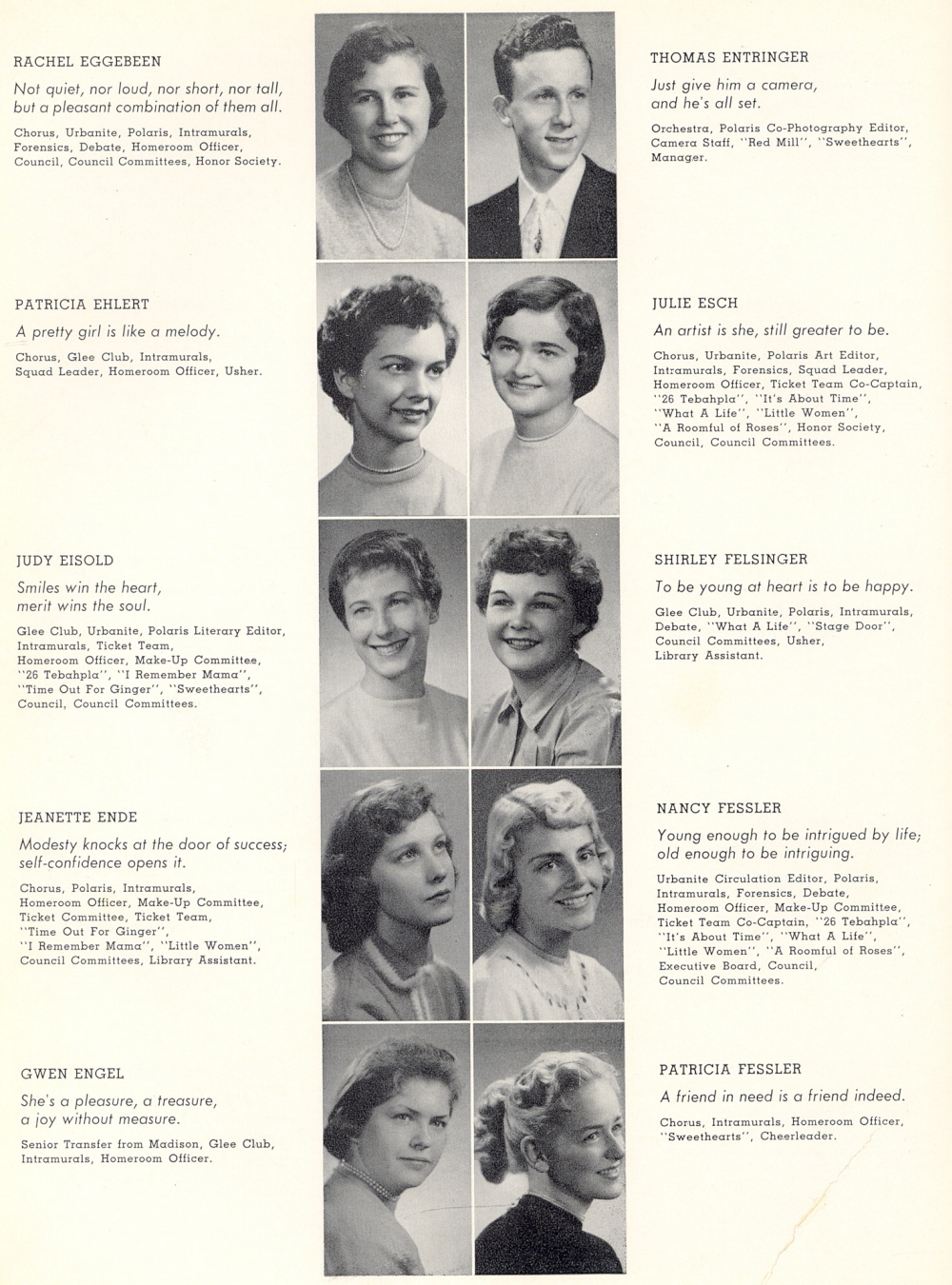 1957 Sheboygan North High School, Page 20: Rachel Eggebeen, Patricia Ehlert, Judy Eisold, Jeanette Ende, Gwen Engel, Thomas Entringer, Julie Esch, Shirley Felsinger, Nancy Fessler, Patricia Fessler.