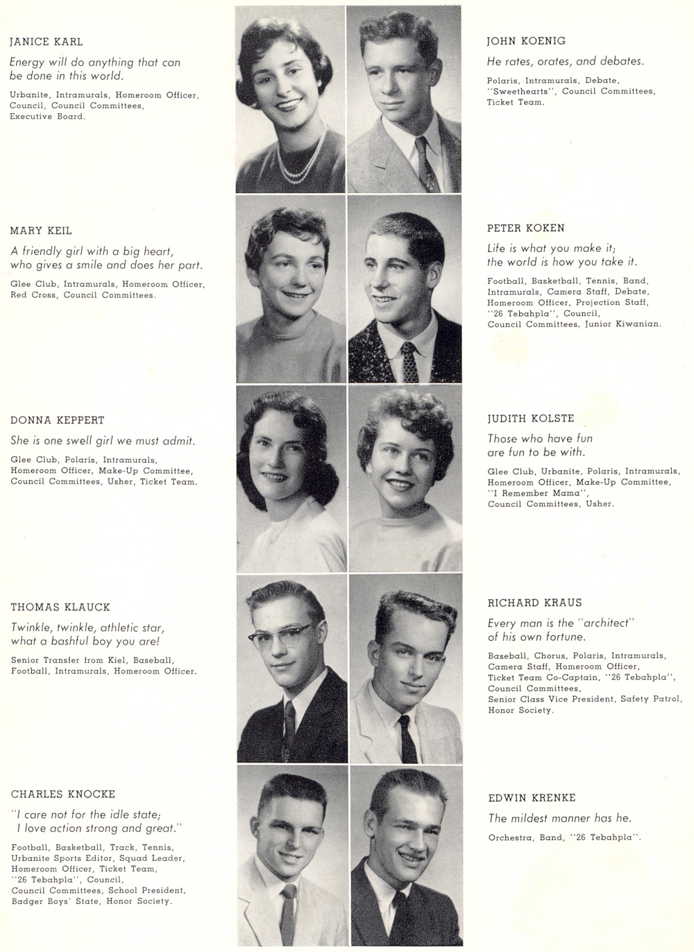 1957 Sheboygan North High School, Page 24: Janice Karl, Mary Keil, Donna Keppert, Thomas Klauck, Charles Knocke, John Koenig, Peter Koken, Judith Kolste, Richard Kraus, Edwin Krenke.