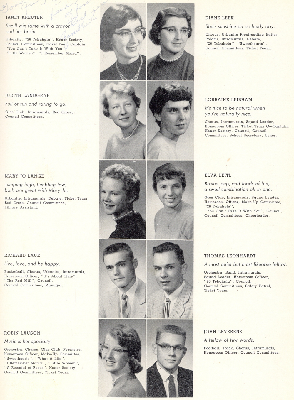 1957 Sheboygan North High School, Page 25: Janet Kreuter, Judith Landgraf, Mary Jo Lange, Richard Laue, Robin Lauson, Diane Leek, Lorraine Liebham, Elva Leitl, Thomas Leonhardt, John Leverenz.