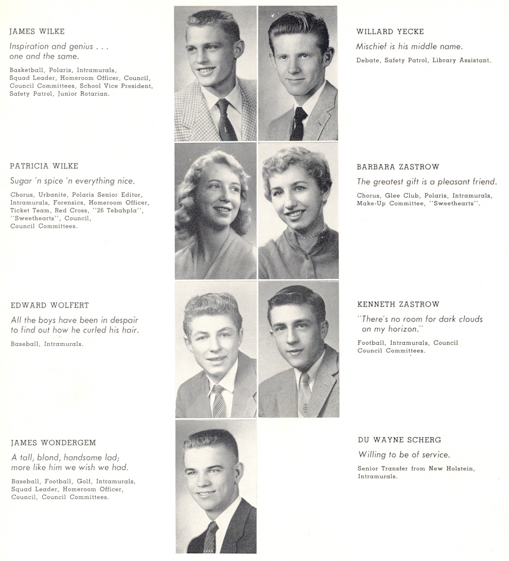 1957 Sheboygan North High School, Page 36: James Wilke, Patricia Wilke, Edward Wolfert, James Wondergem, Willard Yecke, Barbara Zastrow, Kenneth Zastrow, Du Wayne Scherg.