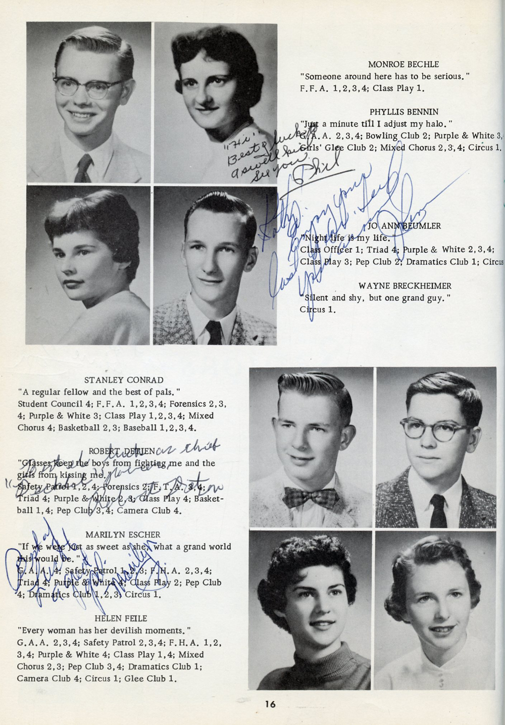 1958 Kiel High School, Page 16: Monroe Bechle, Phyllis Bennin, Jo Ann Beumler, Wayne Breckheimer, Stanley Conrad, Robert Detien, Marilyn Escher, Helen Feile.