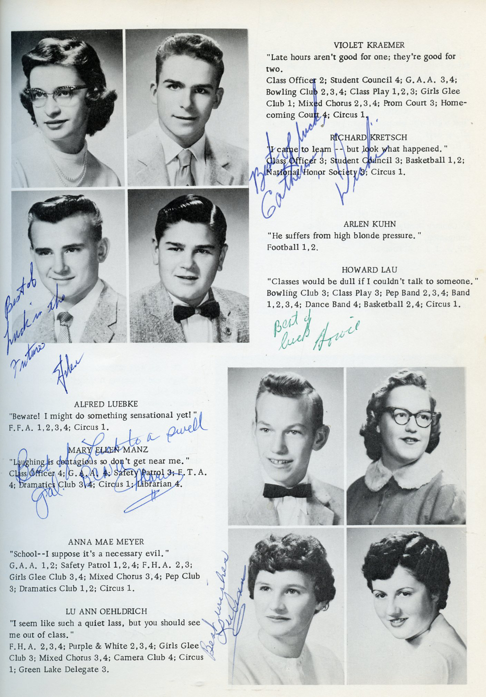 1958 Kiel High School, Page 19: Violet Kraemer, Richard Kretsch, Arlen Kuhn, Howard Lau, Alfred Luebke, Mary Ellen Manz, Anna Mae Meyer, Lu Ann Oehldrich.