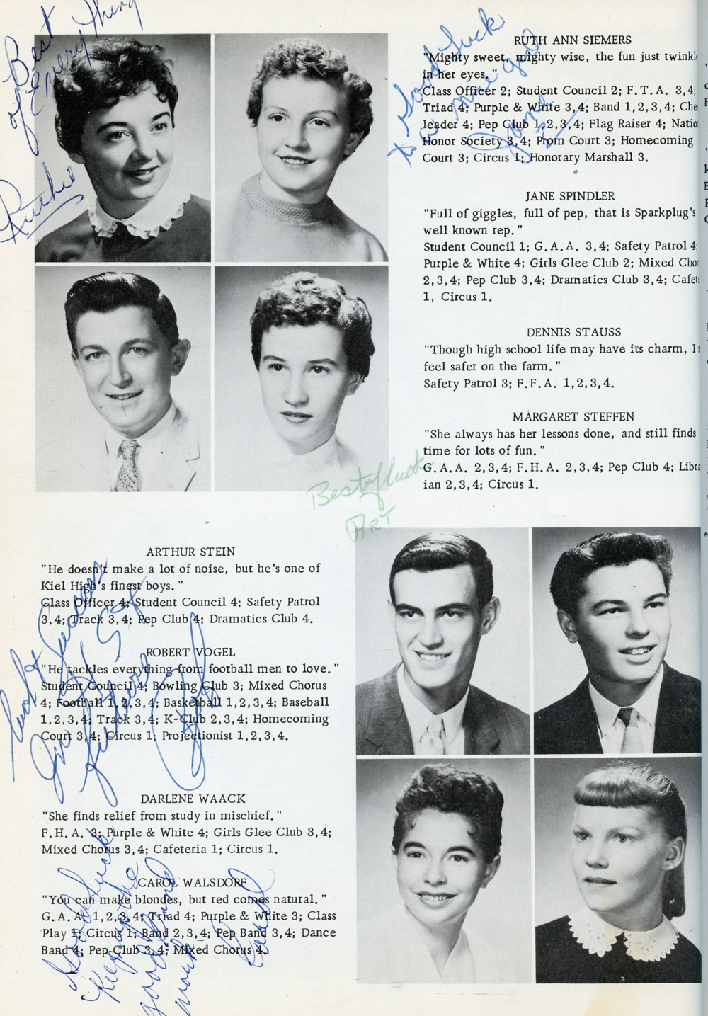 1958 Kiel High School, Page 22: Ruth Ann Siemers, Jane Spindler, Dennis Stauss, Margaret Steffen, Arthur Stein, Robert Vogel, Darlenbe Waack, Carol Walsdorf.