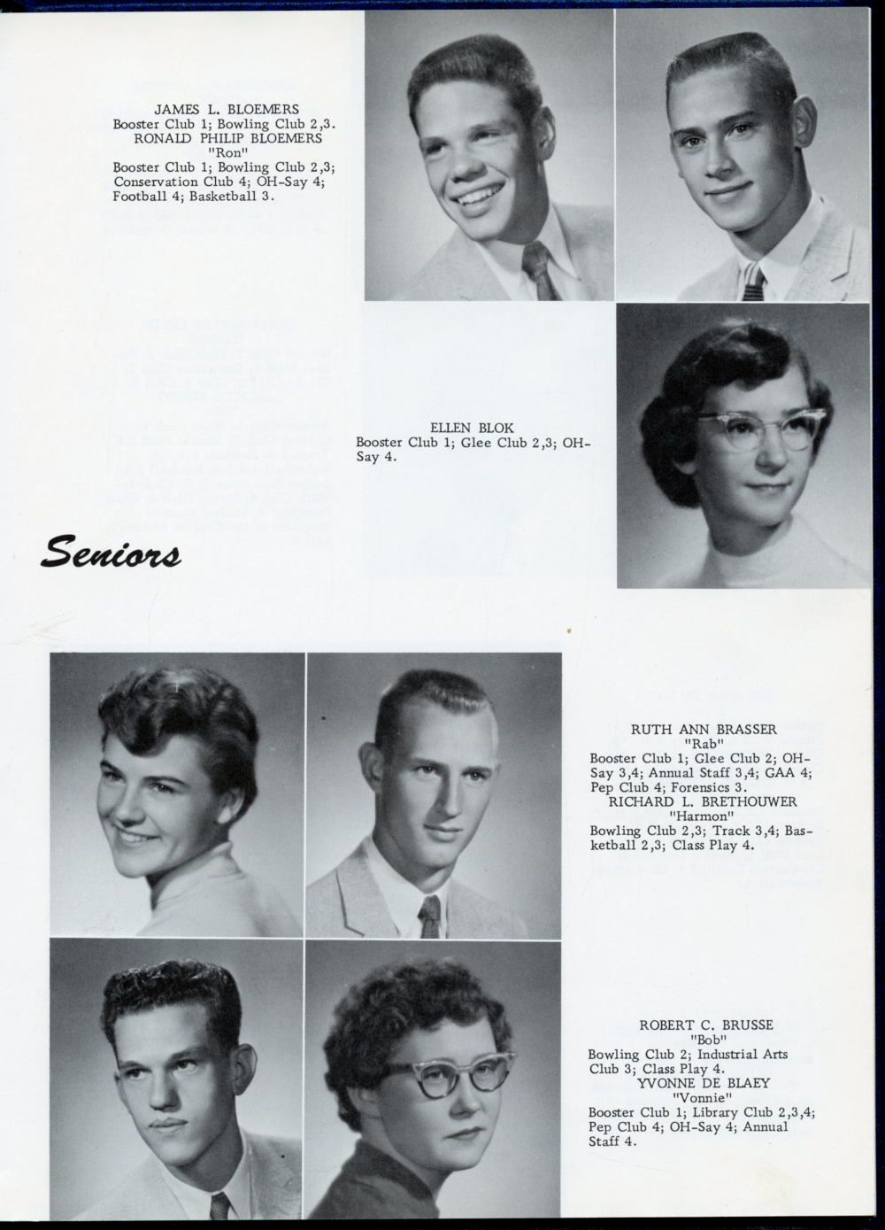 1958 Oostburg High School Yearbook Page 23: James L. Bloemers, Ronald Philip Bloemers, Ellen Blok, Ruth Ann Brasser, Richard L. Brethouwer, Robert C. Brusse, Yvonne De Blaey.