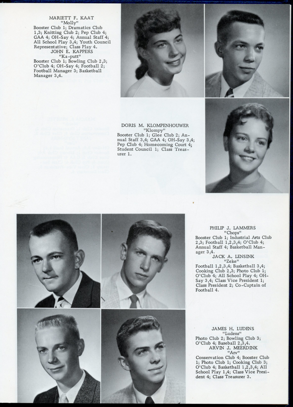 1958 Oostburg High School Yearbook Page 27: Mariett F. Kaat, John E. Kappers, Doris M. Klompenhouwer, Philip J. Lammers, Jack A. Lensink, James H. Ludens, Arvin J. Meerdink.