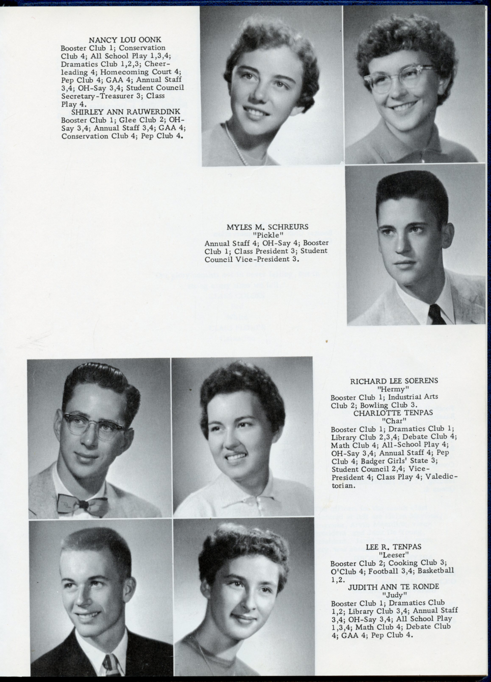 1958 Oostburg High School Yearbook Page 29: Nancy Lou Oonk, Shirley Ann Rauwerdink, Myles M. Schreurs, Richard Lee Soerens, Charlotte Tenpas, Lee R. Tenpas, Judith Ann De Ronde.
