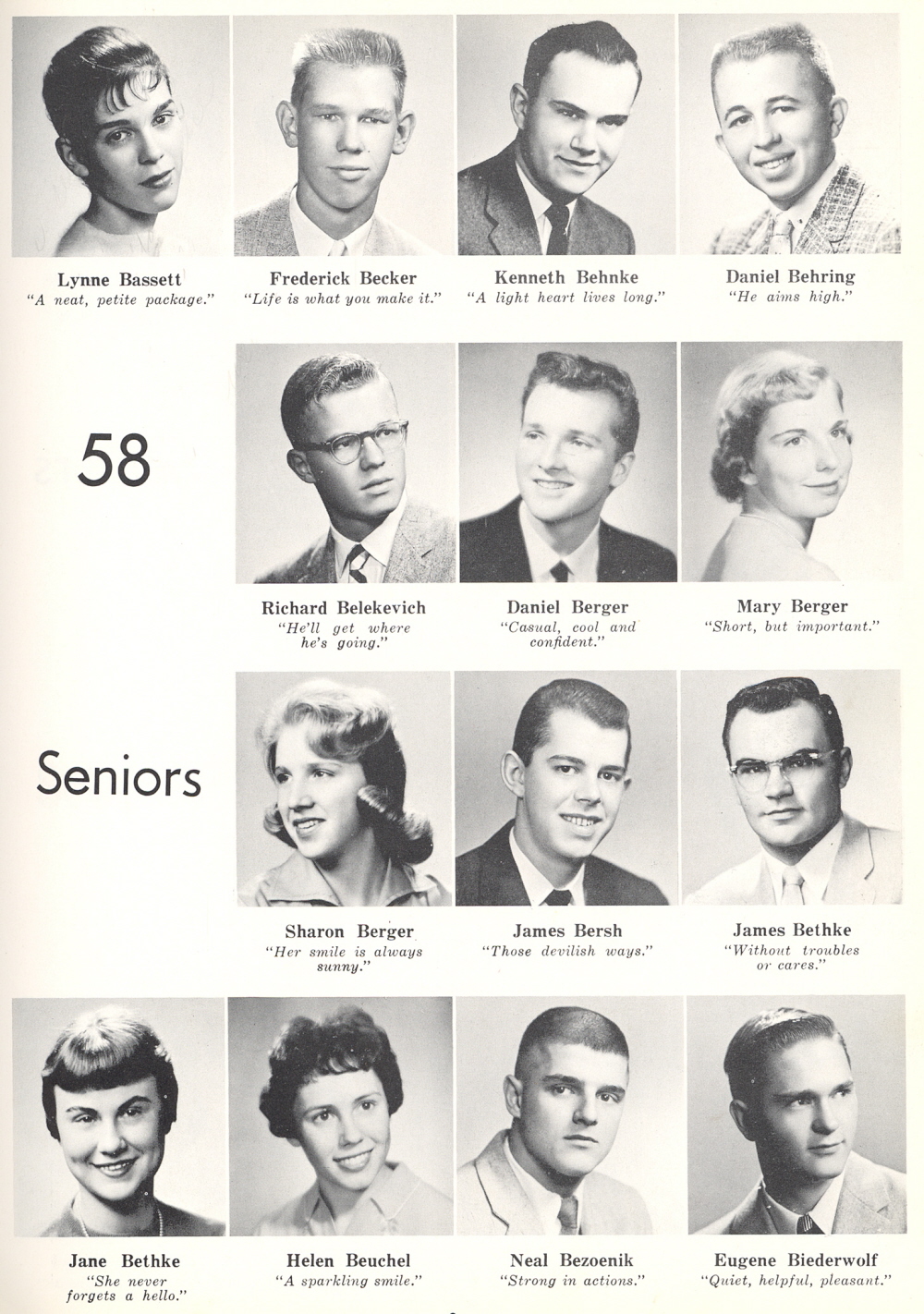 1958 Sheboygan Central High School, Page 21: Lynne Bassett, Frederick Becker, Kenneth Behnke, Daniel Behring, Richard Belekevich, Daniel Berger, Mary Berger, Sharon Berger, James Bersh, James Bethke, Jane Bethke, Helen Beuchel, Neal Bezoenik, Eugene Biederwolf.