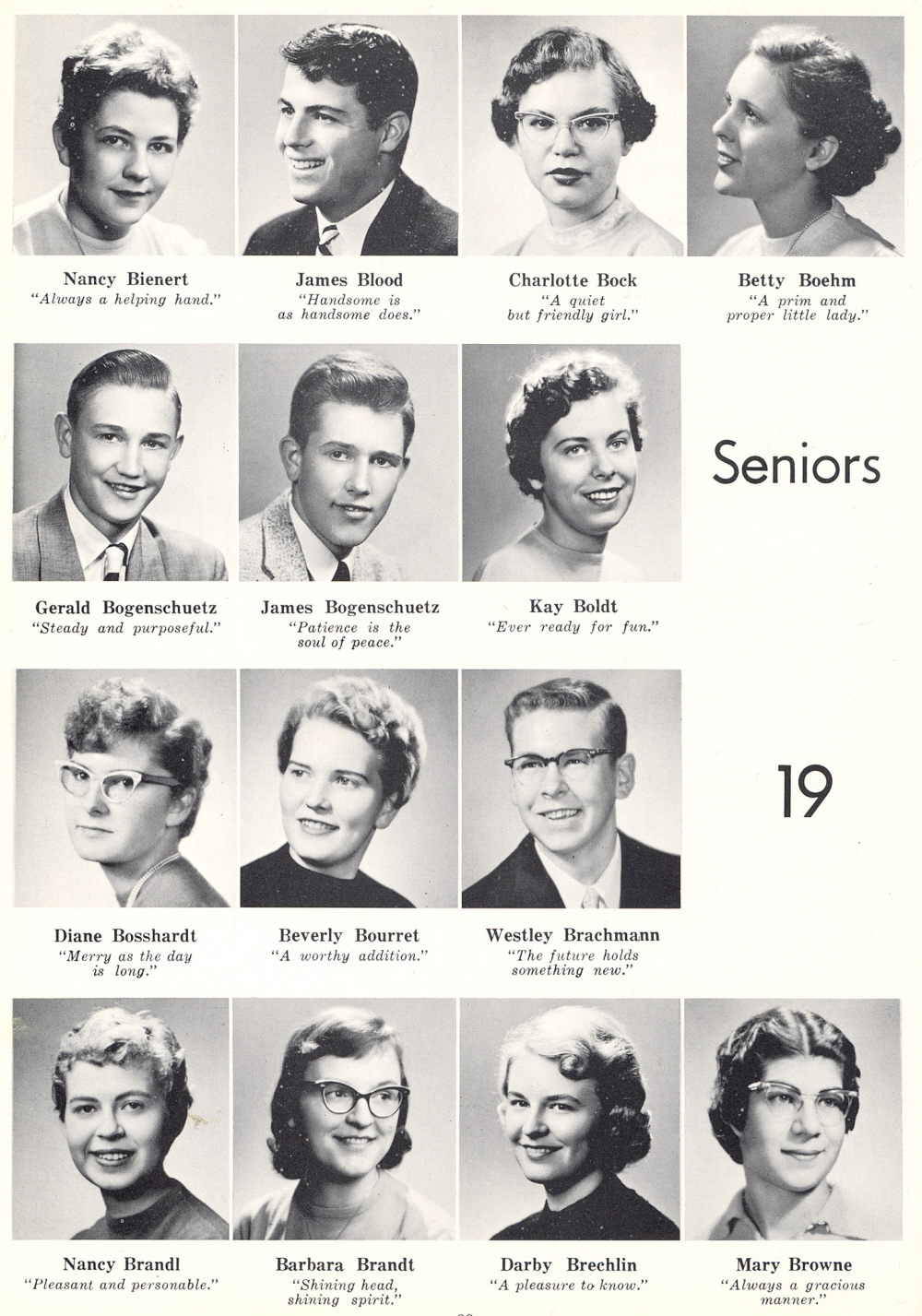 1958 Sheboygan Central High School, Page 22: Nancy Bienert, James Blood, Charlotte Bock, Betty Boehm, Garald Bogenschuetz, James Bogenschuetz, Kay Boldt, Diane Bosshardt, Beverly Bourret, Westley Brachmann, Nancy Brandl, Barbara Brandt, Darby Brechlin, Mary Browne.