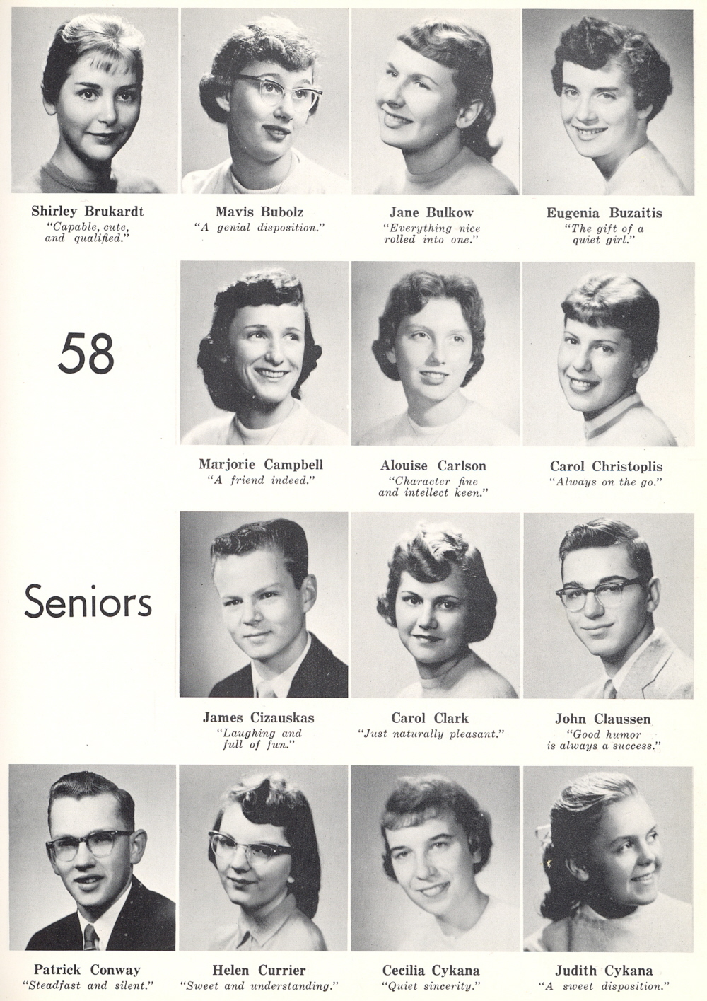 1958 Sheboygan Central High School, Page 23: Shirley Brukardt, Mavis Bubolz, Jane Bulkow, Eugenia Buzaitis, Marjorie Campbell, Alouise Carlson, Carol Christoplis, James Cizauskas, Carol Clark, John Claussen, Patrick Conway, Helen Currier, Cecilia Cykana, Judith Cykana.