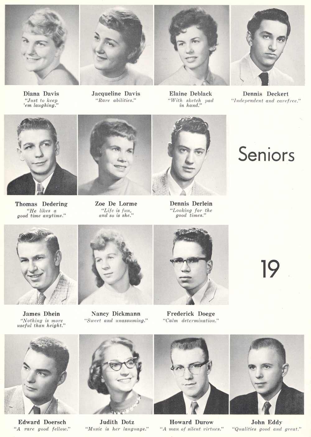 1958 Sheboygan Central High School, Page 24: Diana Davis, Jacqueline Davis, Elaine Deblack, Dennis Deckert, Thomas Dedering, Zoe De Lorme, Dennis Derlein, James Dhein, Nancy Dickmann, Frederick Doege, Edward Doersch, Judith Dotz, Howard Durow, John Eddy.