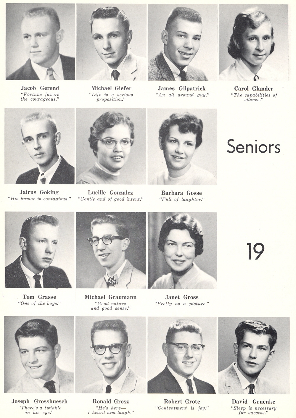 1958 Sheboygan Central High School, Page 26: Jacob Gerend, Michael Giefer, James Gilpatrick, Carol Glander, Jairus Goking, Lucille Gonzalez, Barbara Gosse, Tom Grasse, Michael Graumann, Janet Gross, Joseph Grosshuesch, Ronald Grosz, Robert Grote, David Gruenke.