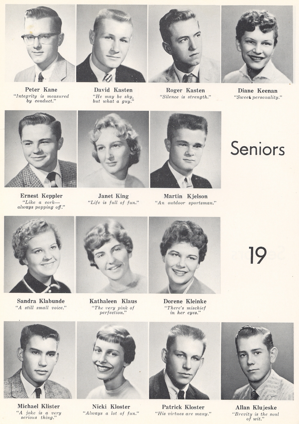 1958 Sheboygan Central High School, Page 30: Peter Kane, David Kasten, Roger Kasten, Diane Keenan, Ernest Keppler, Janet King, Martin Kjelson, Sandra Klabunde, Kathaleen Klaus, Dorene Kleinke, Michael Klister, Nicki Kloster, Patrick Kloster, Allan Klujeske.