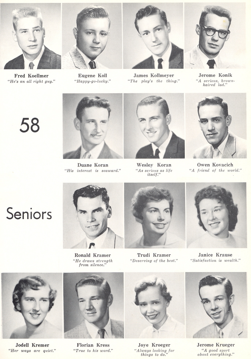 1958 Sheboygan Central High School, Page 31: Fred Koellmer, Eugene Koll, James Kollmeyer, Jerome Konik, Duane Koran, Wesley Koran, Owen Kovacich, Ronald Kramer, Trudi Kramer, Janice Krause, Jodell Kremer, Florian Kress, Joye Kroeger, Jerome Krueger.