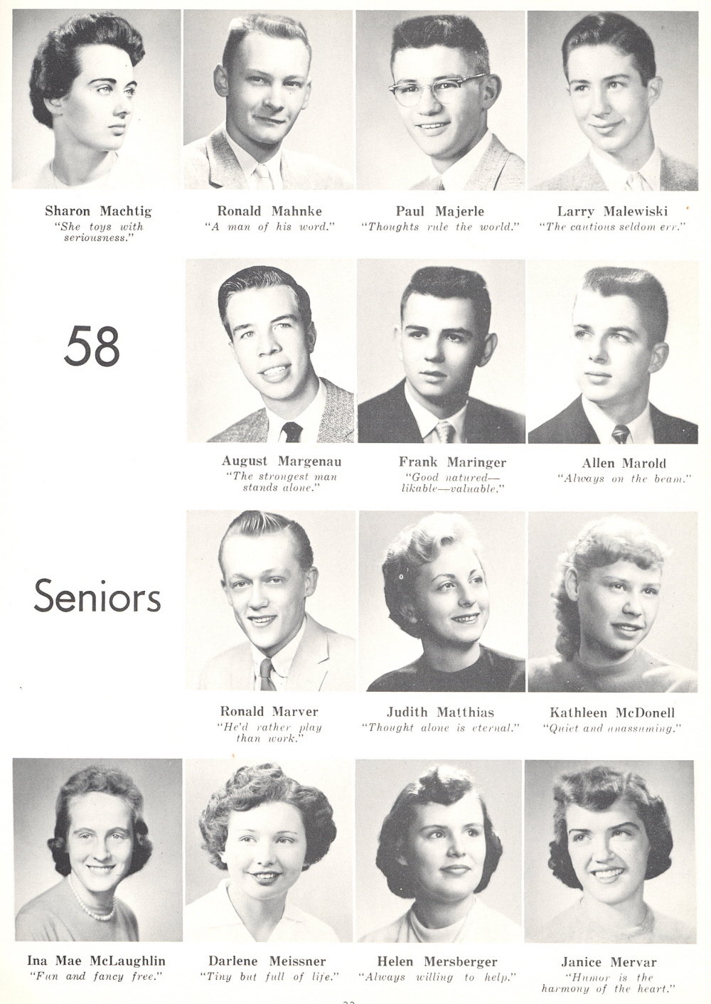 1958 Sheboygan Central High School, Page 33: Sharon Machtig, Ronald Mahnke, Paul Majerle, Larry Malewiski, August Margenau, Frnk Maringer, Allen Marold, Ronald Marver, Judith Matthias, Kathleen McDonell, Ina Mae McLaughlin, Darlene Meissner, Helen Mersberger, Janice Mervar.