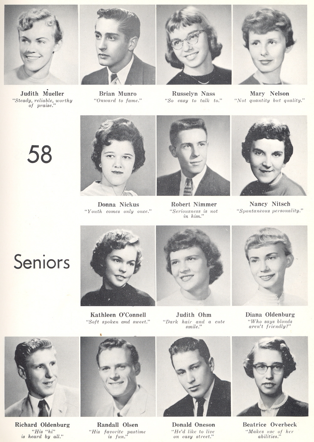1958 Sheboygan Central High School, Page 35: Judith Mueller, Brian Munro, Russelyn Nass, Mary Nelson, Donna Nickus, Robert Nimmer, Nancy Nitsch, Kathleen O'Connell, Judith Ohm, Diana Oldenburg, Richard Oldenburg, Randall Olsen, Donald Oneson, Beatrice Overbeck.