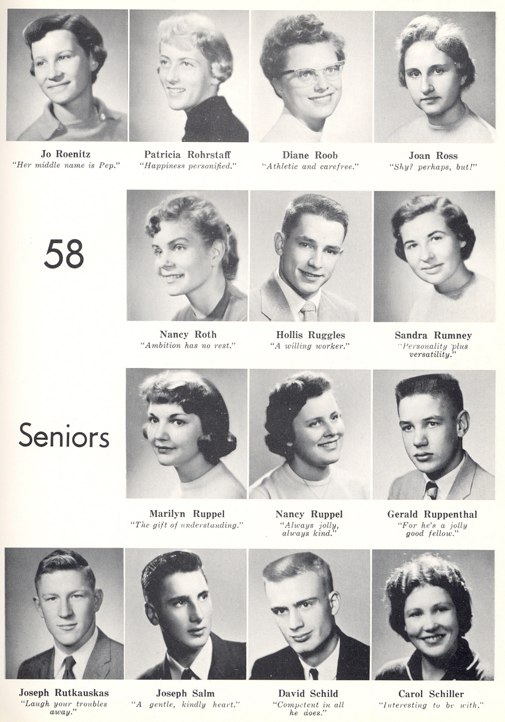 1958 Sheboygan Central High School, Page 39: Jo Roenitz, Patricia Rohrstaff, Diane Roob, Joan Ross, Nancy Roth, Hollis Ruggles, Sandra Rumney, Marilyn Ruppel, Nancy Ruppel, Gerald Ruppenthal, Joseph Rutkauskas, Joseph Salm, David Schild, Carol Schiller.