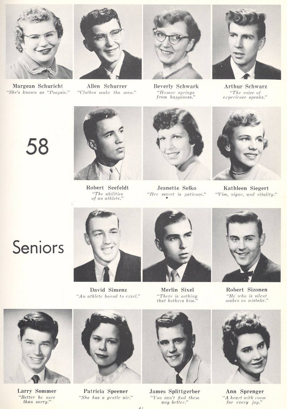 1958 Sheboygan Central High School, Page 41: Margaret Schuricht, Allen Schurrer, Beverly Schwark, Arthur Schwarz, Robert Seefeldt, Jeanette Selko, Kathleen Siegert, David Simenz, Merlin Sixel, Robert Sizonen, Larry Sommer, Patricia Speener, James Splittgerber, Ann Sprenger.