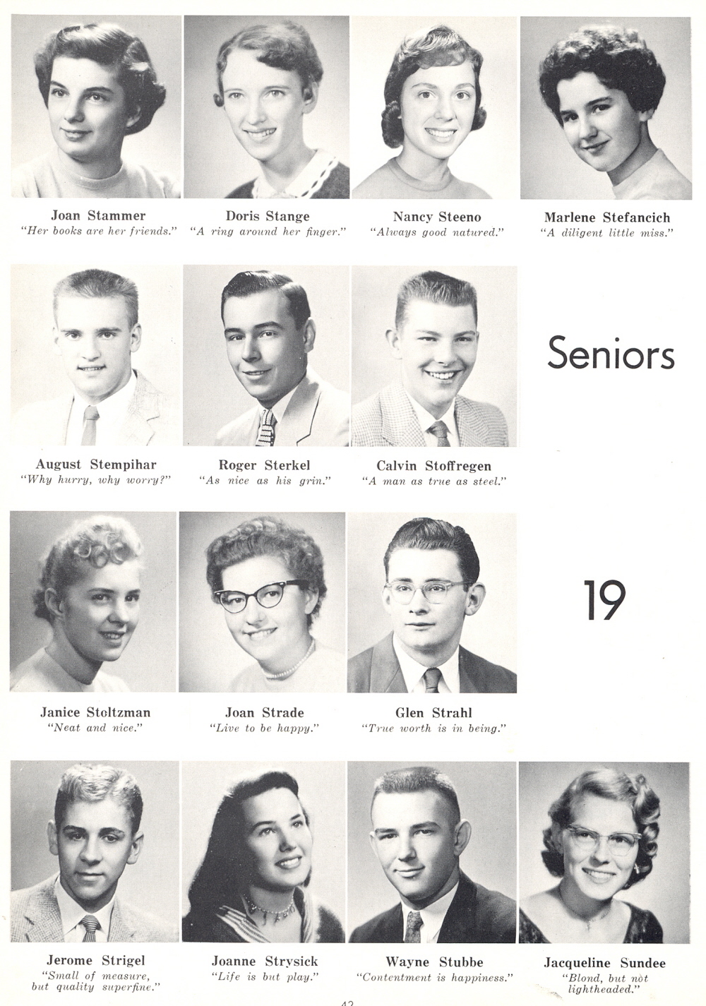 1958 Sheboygan Central High School, Page 42: Joan Stammer, Doris Stange, Nancy Steeno, Marlene Stefancich, August Stempihar, Roger Sterkel, Calvin Stoffregen, Janice Stoltzman, Joan Strade, Glen Strahl, Jerome Strigel, Joanne Strysick, Wayne Stubbe, Jacqueline Sundee.