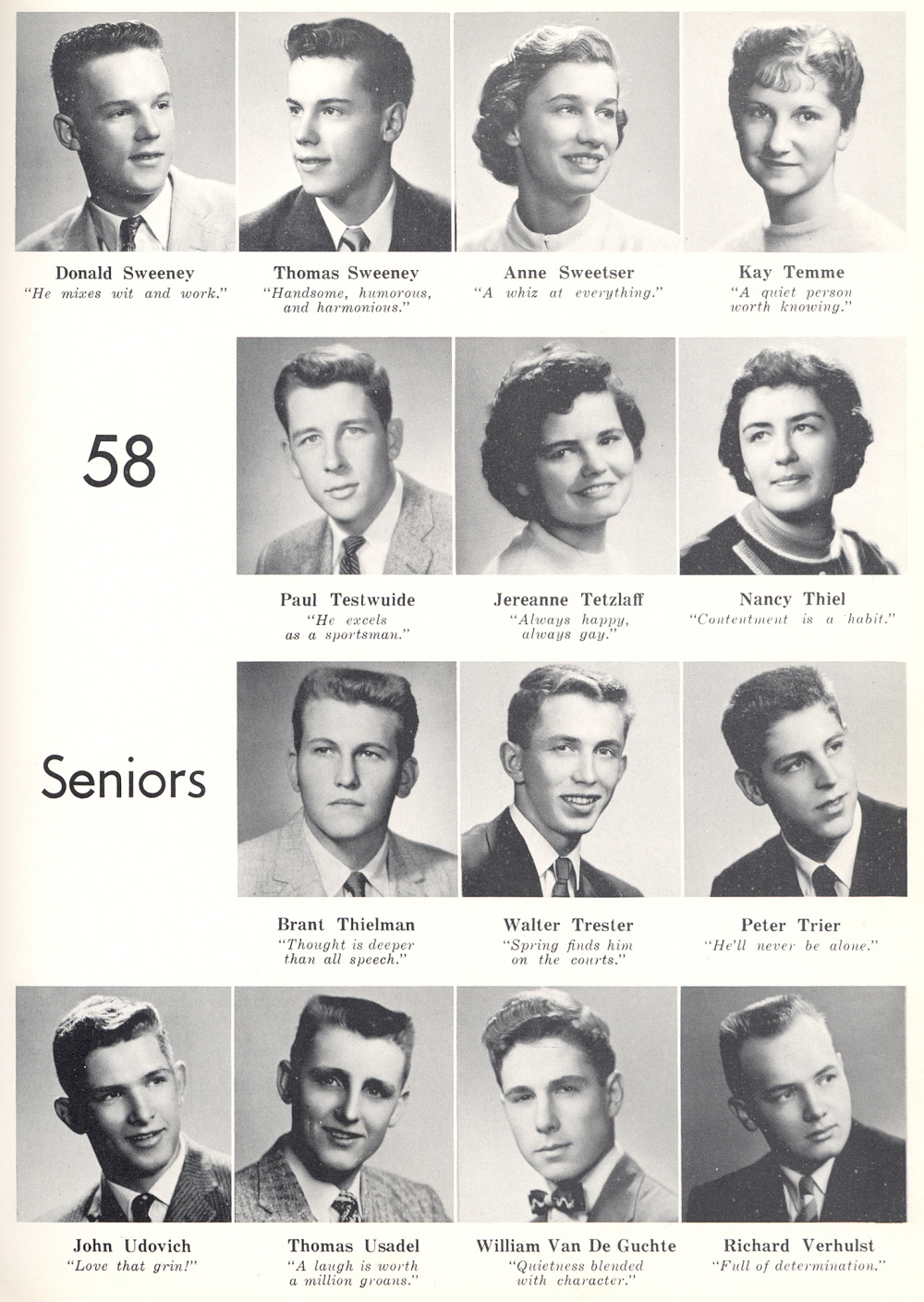 1958 Sheboygan Central High School, Page 43: Donald Sweeney, Thomas Sweeney, Anne Sweetser, Kay Temme, Paul Testwuide, Jereanne Tetzlaff, Nancy Thiel, Brant Thielman, Walter Trester, Peter Trier, John Udovich, Thomas Usadel, William Van De Guchte, Richard Verhulst.