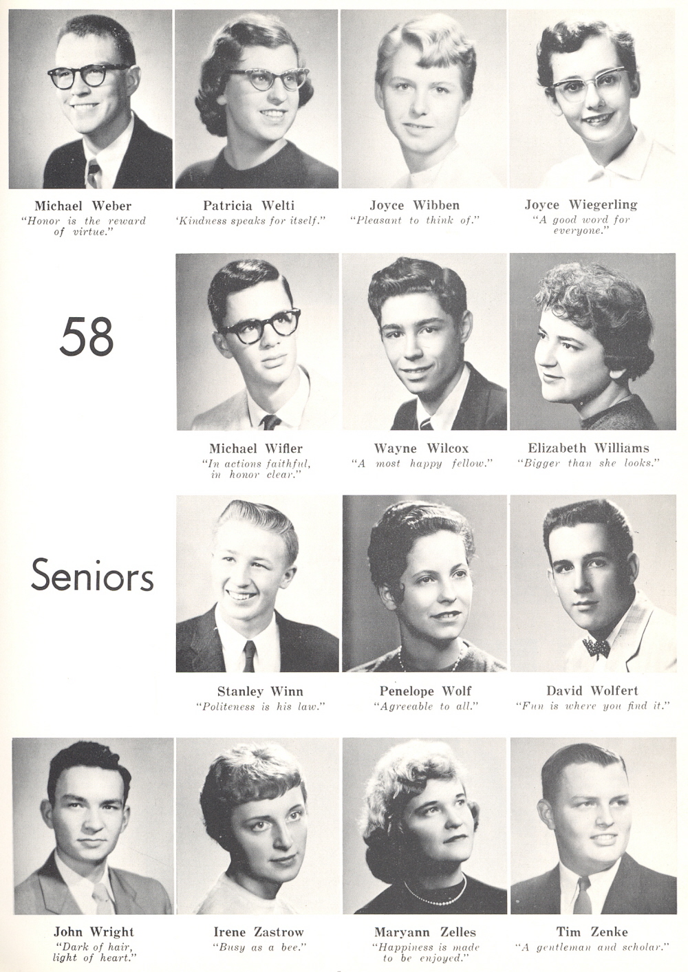 1958 Sheboygan Central High School, Page 45: Michael Weber, Patricia Welti, Joyce Wibben, Joyce Wiegerling, Michael Wifler, Wayne Wilcox, Elizabeth Williams, Stanley Winn, Penelope Wolf, David Wolfert, John Wright, Irene Zastrow, Maryann Zelles, Tim Zenke.
