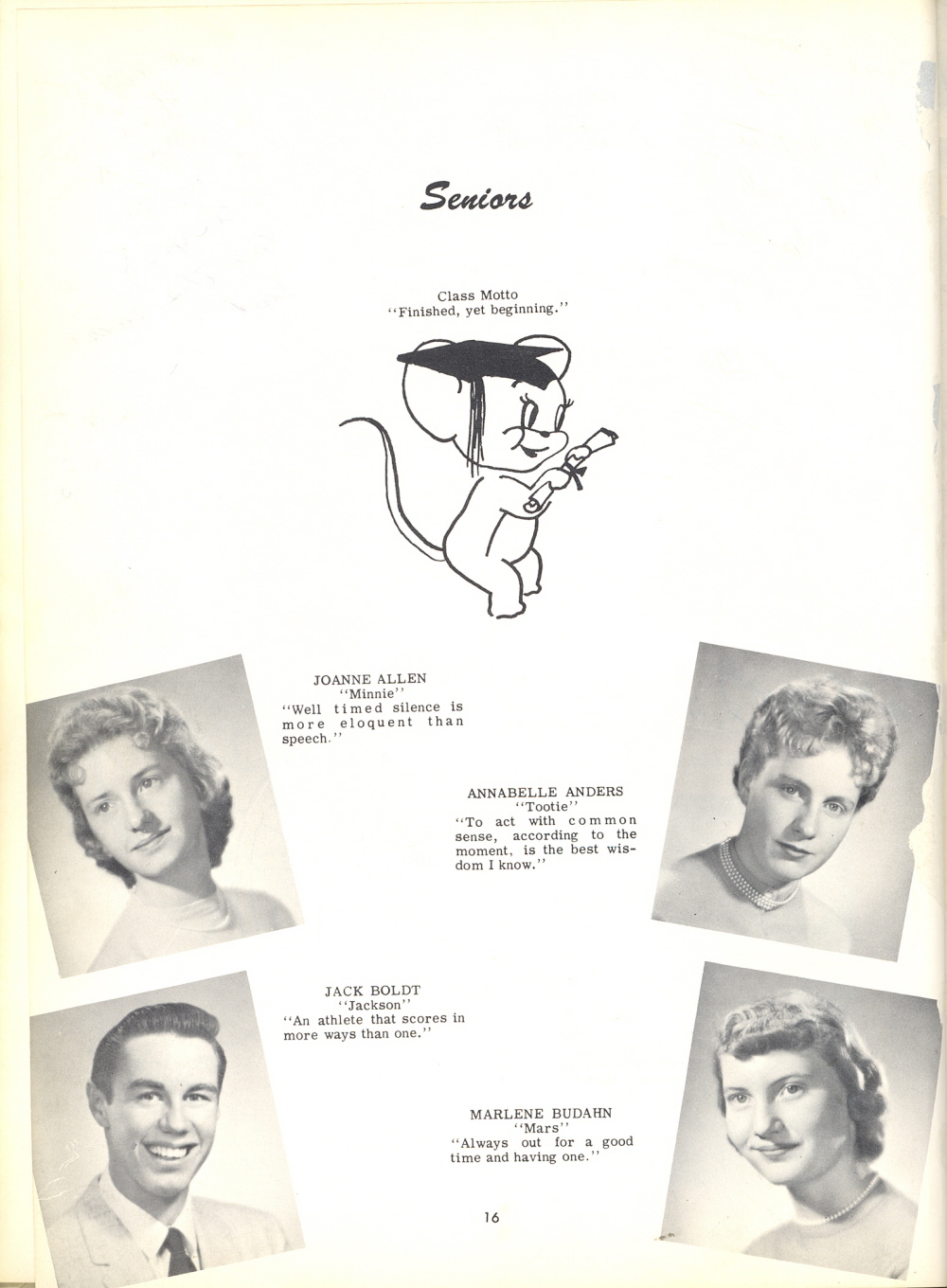 1958 Sheboygan Falls High School, Pages 16 and 90: Joanne Allen, Annabelle Anders, Jack Boldt, Marlene Budahn.