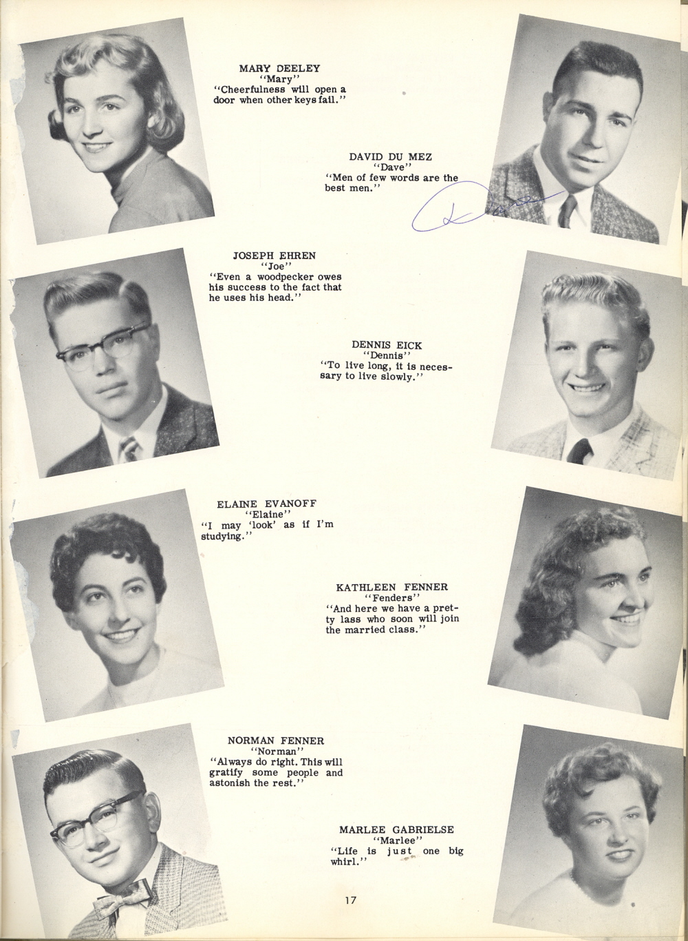 1958 Sheboygan Falls High School, Pages 17 and 90: Mary Deeley, David Du Mez, Joseph Ehren, Dennis Eick, Elaine Evanoff, Kathleen Fenner, Norman Fenner, Marlee Gabrielse.