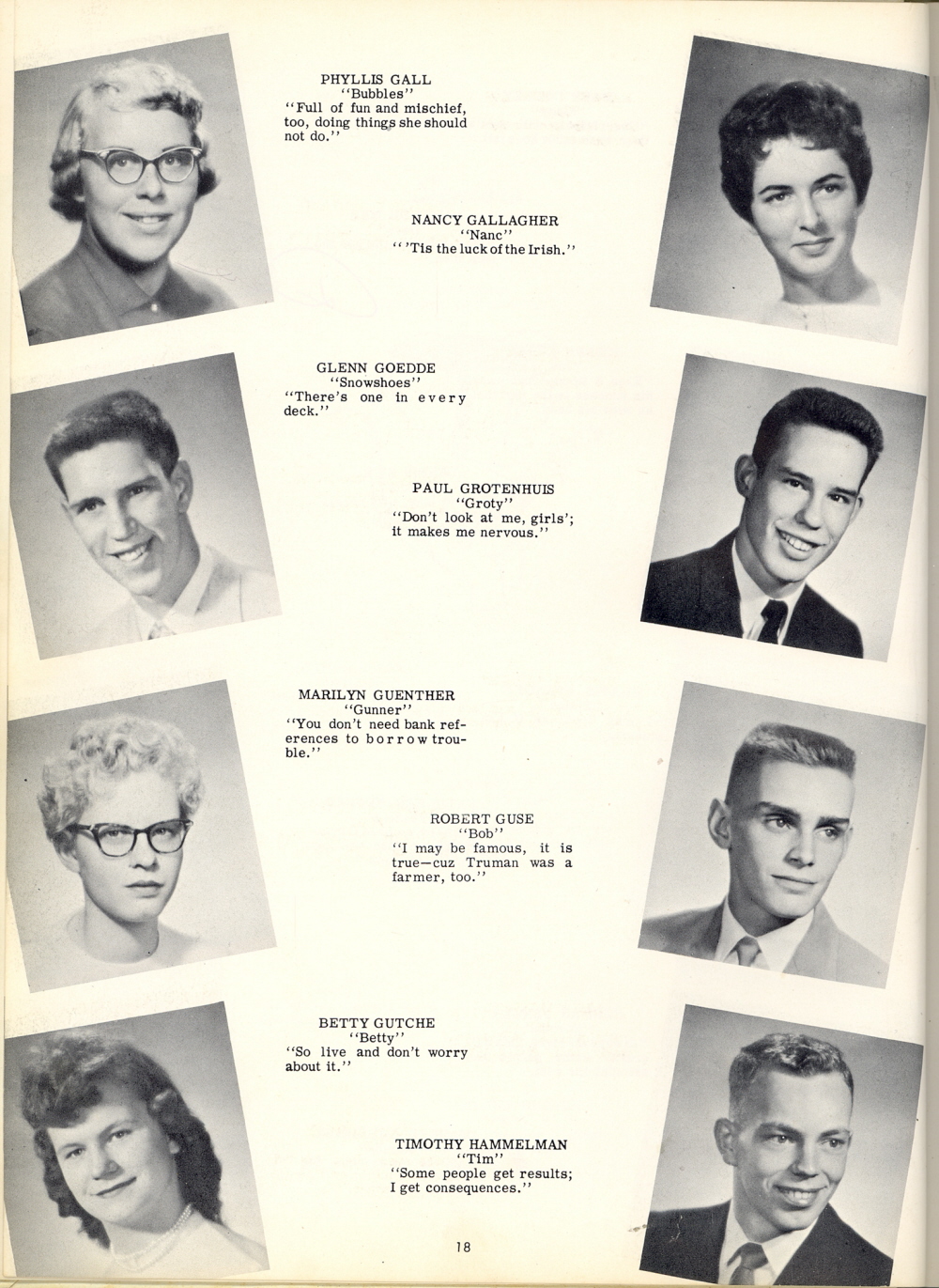 1958 Sheboygan Falls High School, Pages 18 and 90: Phyllis Gall, Nancy Gallagher, Glenn Goedde, Paul Grotenhuis, Marilyn Guenther, Robert Guse, Betty Gutche, Timothy Hammelman.