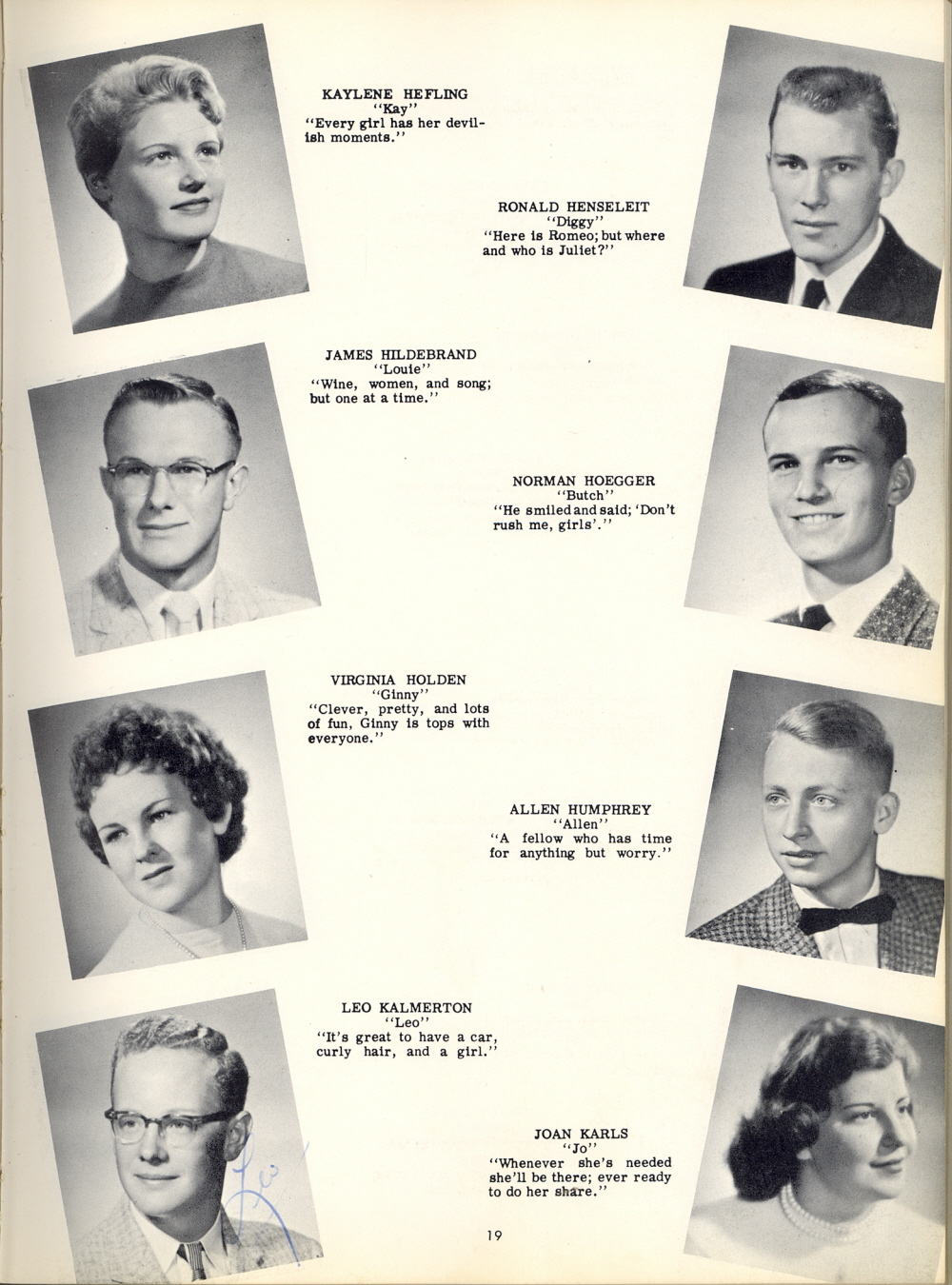 1958 Sheboygan Falls High School, Pages 19, 90 and 91: Kaylene Hefling, Ronald Henseleit, James Hildebrand, Norman Hoegger, Virginia Holden, Allen Humphrey, Leo Kalmerton, Joan Karls.